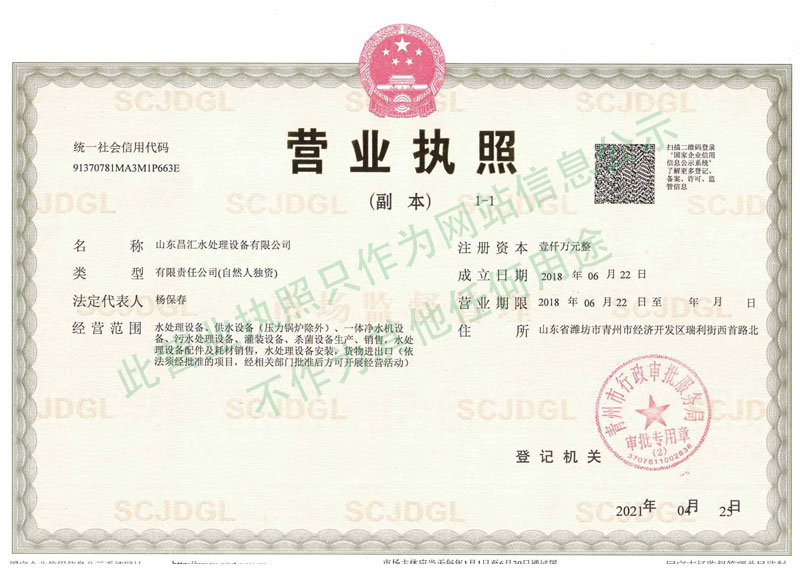 山东昌汇水处理设备有限公司是专注从事水处理设备及灌装杀菌净化设备制造商,公司集水处理技术开发、设备制造、工程安装、销售服务于一体的综合性企业。